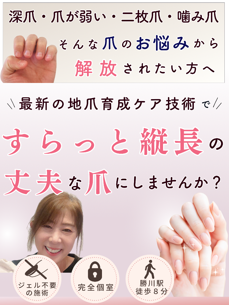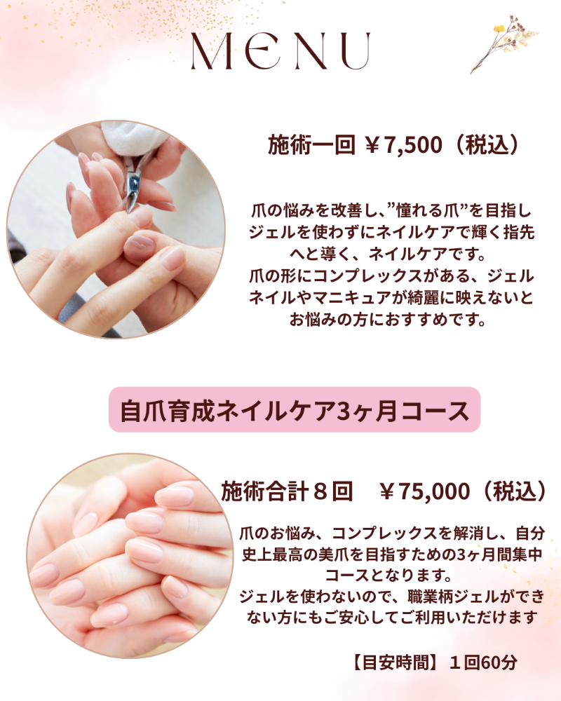 爪の悩みを持っている方を1人でもこの技術で喜んでもらいたいとの想いで今では“爪の育成ネイルケア専門店”をしています。